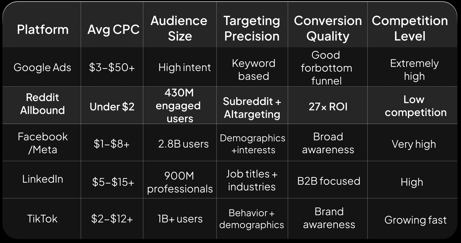 Get 27x more ROI than Google, Meta, or TikTok with our AI-powered Reddit advertising system that finds and converts your perfect customers while they're asking for help.